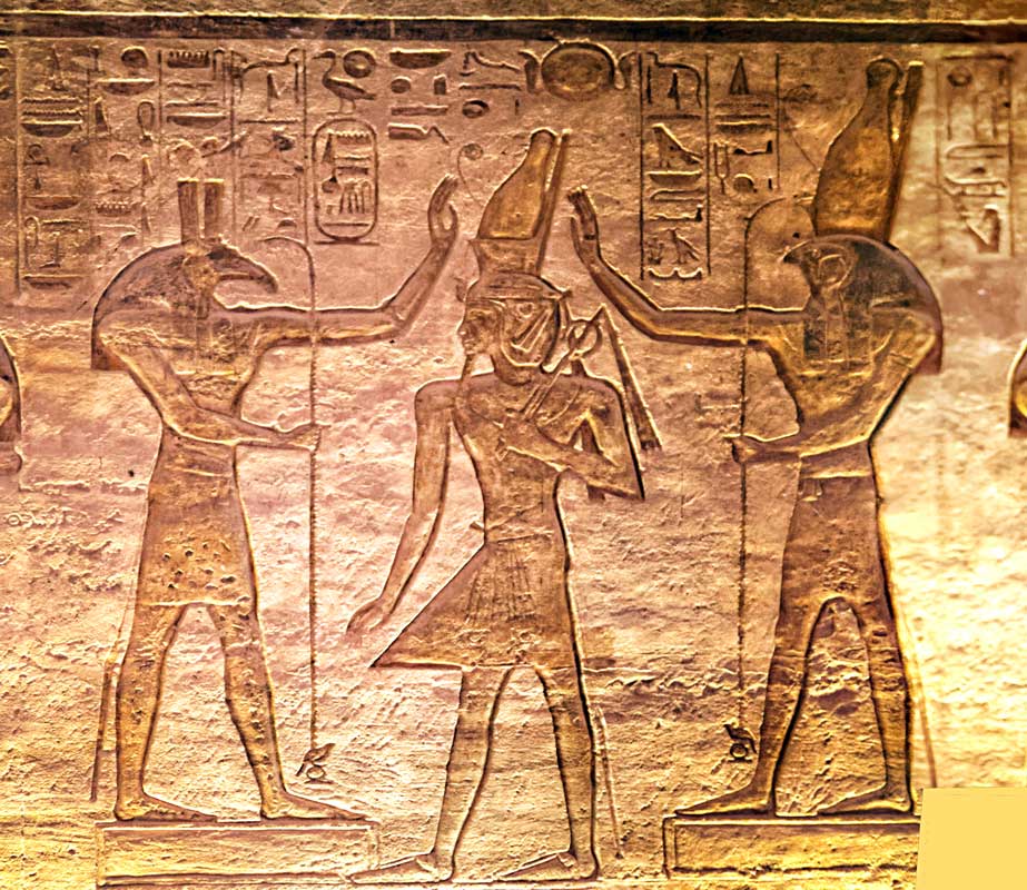 Paroi Sud, côté est : le roi Ramsès II se tient devant Hathor. Il porte la couronne de Ptah-Tatenen.