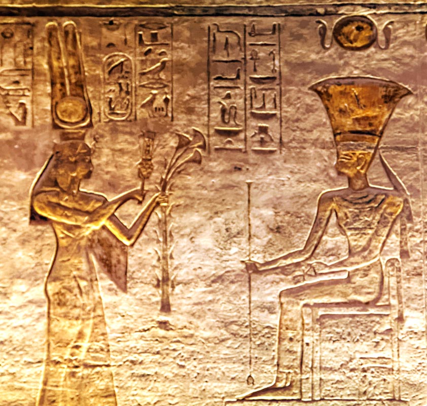 Scène suivante : Nefertari offre à la déesse Anouket des papyrus et le sistre-naos. Anouket porte son élégante coiffure où s'évase un bouquet végétal. Elle donne à la reine toute vie et prospérité, toute santé et toute joie.