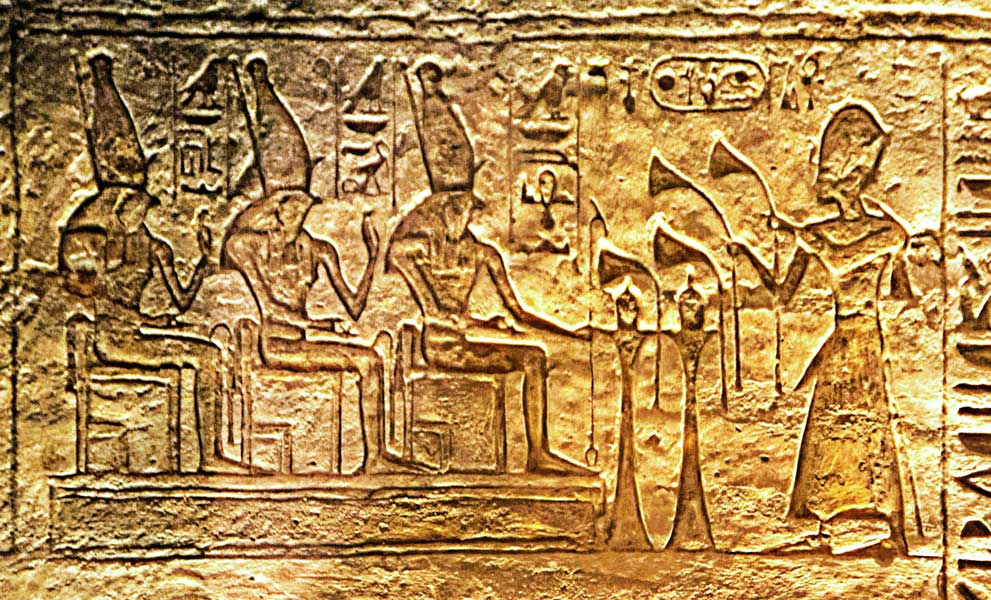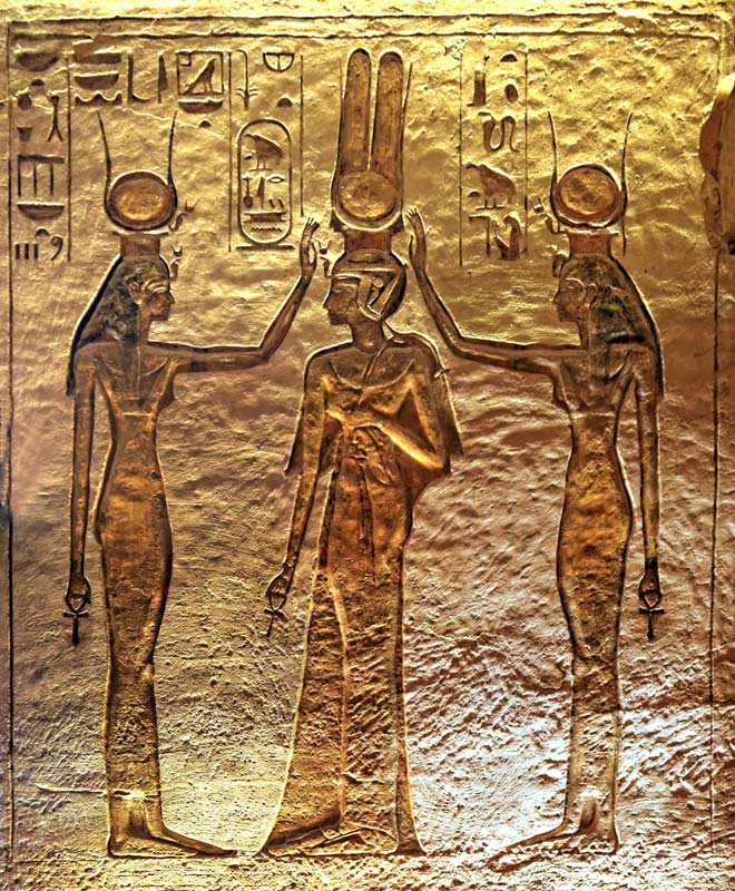 Paroi Est côte Sud : la reine Nefertariy est couronnée par Isis et Hathor d'Ibchek. Cet honneur est d'habitude réservé aux rois. Ainsi Ramsès II montre par cette scène toute l'affection qu'il porte à la reine, la mettant sur un pied d'égalité avec lui.