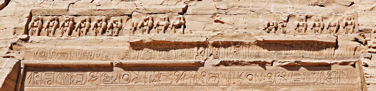 Sur la façade, au dessus des colosses et de Rê-Horakhty, des babouins assis, les mains posées sur les genoux, saluent chaque matin l'arrivée du soleil. Sur les 20 ou 21, il en reste 12 intacts et les restes de 4 autres. Juste en dessous des babouins, une frise des noms de Ramsès II et un texte dont les inscriptions sont symétriques par rapport au centre.