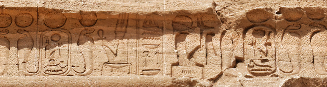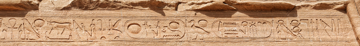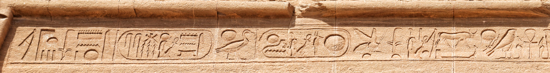 Cette inscription dédicatoire est relativement classique et se retrouve dans la plupart des temples ( voir l'Akhmenou de Thoutmosis III par exemple). Il dit :"Vive l'Horus , taureau puissant, aimé de Maât, le roi de Haute et de Basse Égypte <Ouser-Maât-Rê Setep-en-Rê> , le fils de Rê <Ramses Mery-Amon> aimé d'Amon-Rê, roi des dieux". Les traductions des textes sur ce site sont en général tirées de l'ouvrage de Madeleine Peters-Destéract.