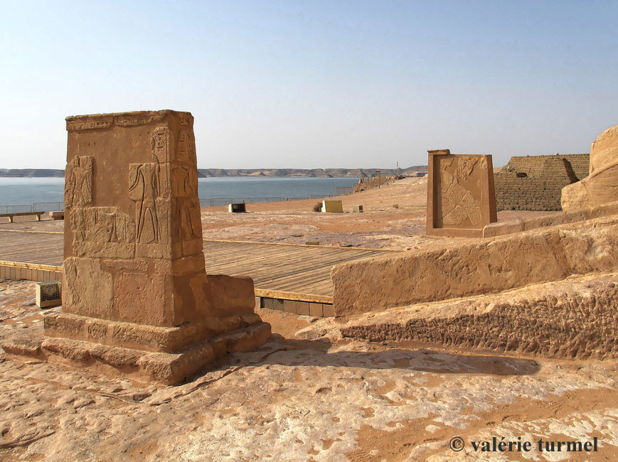 On accéde à la terrase par une rampe dont on voit le début à droite. Précédant la rampe, dex stèles pouvaient être utlisées pour déposer des offrandes. Très abimées, elles ont été reconstituées.