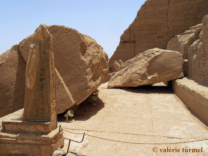 Les morceaux du 2ème colosse gisent sur la terrasse. Au fond, sur la paroi, la stèle dite du mariage.