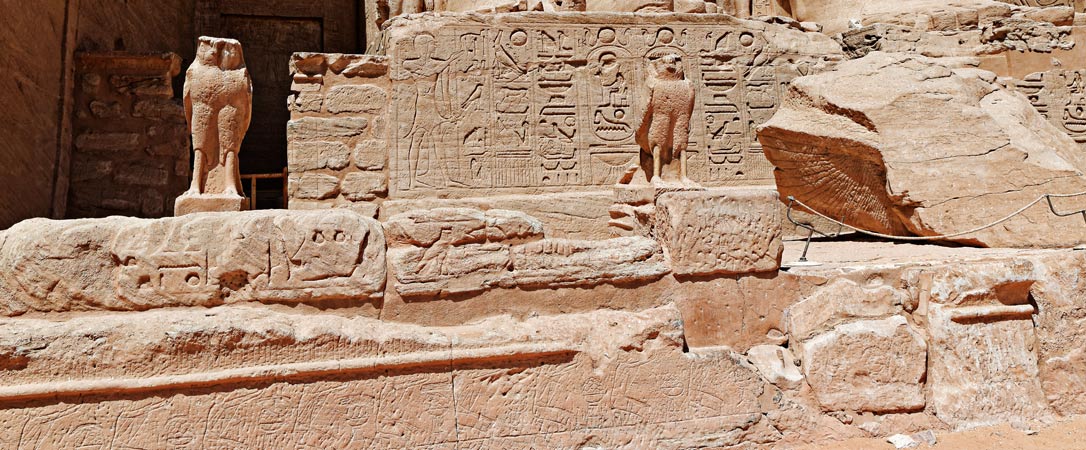 Du côté Sud, la terrasse a été très abîmée lors de la chute d'une partie du deuxième colosse. Sur le soubassement, ce sont ici des Nubiens qui sont représentés. Au dessus, la fin du texte qui fait référence à Amon-Rê du côté Sud. C'est plus clair sur la façade où l'inscription est bien conservée. A droite, une partie de la coiffe du 2ème colosse.