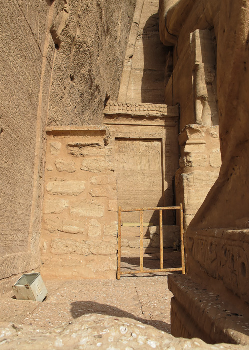 Comme du côté Nord, entre la paroi et le premier colosse, a été dressée une grande stèle. Un muret et une porte forment une espèce de cour. Derrière le muret, sur la paroi, se trouve une petite stèle datant de la visite de Ramsès-Siptah.