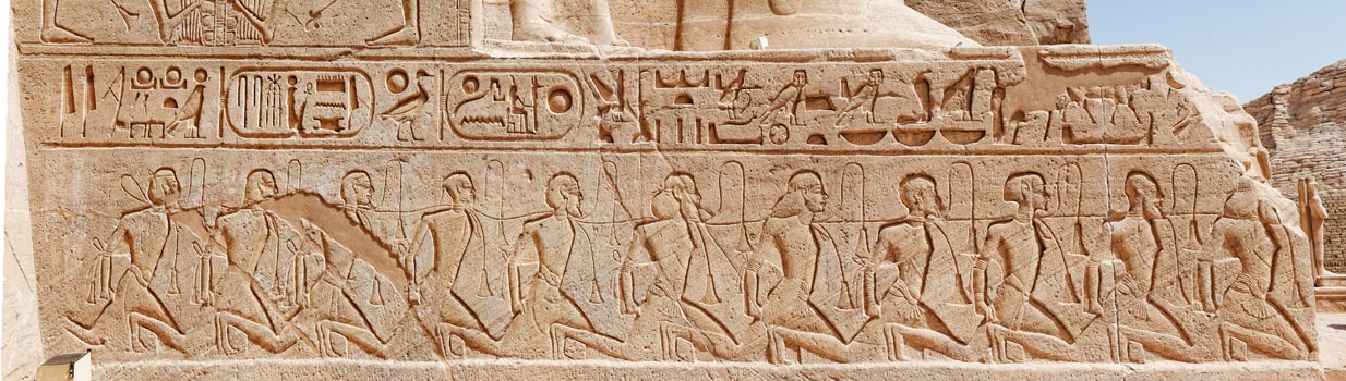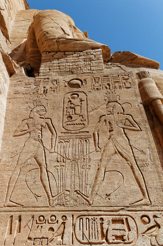 Colosse Nord près de l'entrée : le Sema-Taouy décore la face Sud de ce colosse. Deux dieux Nil procèdent à la ligature des plantes héraldiques, le lys et le papyrus. Le génie Nil de gauche représente la Haute Égypte avec ses papyrus, celui de droite la Basse Égypte avec les lys. En dessous, une partie de l'inscription au dessus de la file des prisonniers qui sont des asiatiques au Nord.