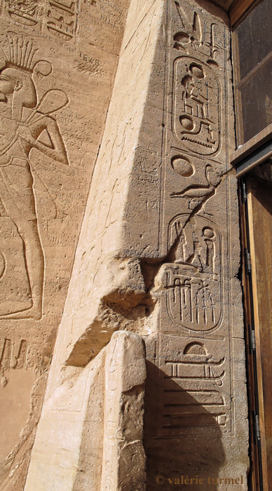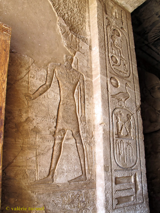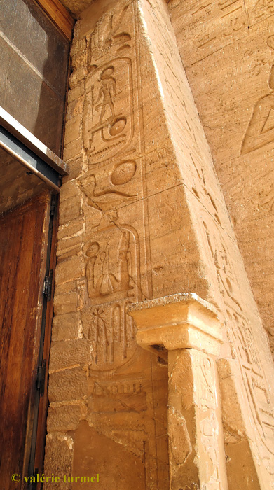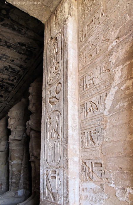 Le roi est dit ".. aimé de Rê-Horakhty" sur l'inscription de gauche. Sur la paroi, entre les colonnes avec les titulatures, les lignes d'hiéroglyphes sont en partie effacées. Une litanie évoque Ramsès avec ces appellations, de haut en bas :
