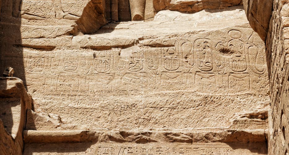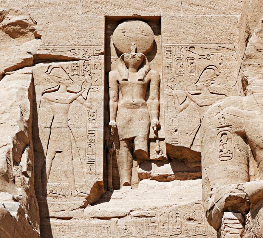 En y regardant de plus près, on voit que Rê tient dans ses deux mains des signes ankh. Sculptés eux aussi en haut-relief, à droite le sceptre Ouser et à gauche une représentation de la Maât, ce qui se lit comme un rébus géant : Ouser-Maât-Rê. Ramsès II s'identifie ainsi à Rê-Horakhty dès l'entrée du temple. Cette fusion divine se retrouvera plusieurs fois dans le temple.