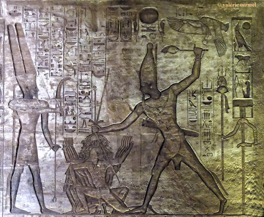 Paroi Est côte Sud : le roi massacre des ennemis, apparemment des nubiens et des asiatiques, devant Amon-Rê qui lui tend un glaive. Le roi porte le pschent sur la tête et il est vêtu d'un pagne. Les prisonniers demandent grâce. Le Ka royal est représenté derrière le roi. Cette scène, habituellement représenté sur le pylône du temple, a été reportée au dos de ce qui tient lieu de pylône, la façade avec les colosses. En dessous de cette scène se trouve un défilé de 8 fils de Ramsès classés par ordre de naissance.