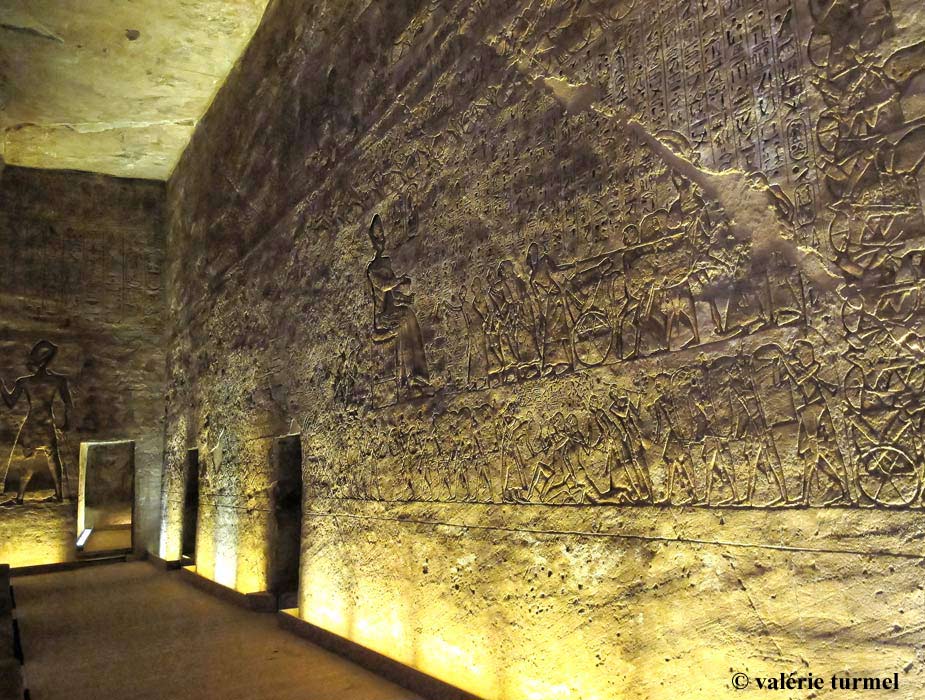 Ce côté nord de la première hypostyle donne permet également l'accès à différentes salles du trésor, don't description est présentée par ailleurs. A gauche, sur la paroi Ouest, le roi présente les prisonniers à 3 divinités.