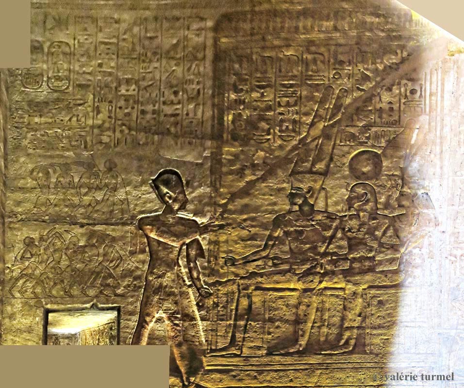 Le roi présente en offrandes ses prisonniers à une triade divine. Le texte au dessus des prisonniers indique que ceux-ci vont travailler dans les ateliers des temples. Cette triade est composée d'Amon, de Ramsès II divinisé et de Mout. Le graveur a du faire de la place pour Ramsès en poussant Mout vers la droite, car son ancienne couronne est encore visible.