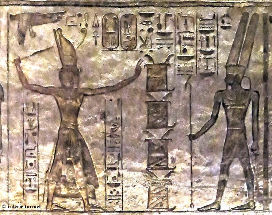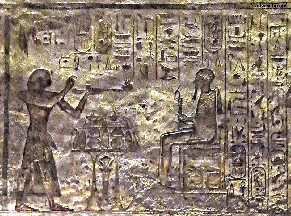 Ramsès II jette dans le brasier des grains de résine odorante pour le dieu Ptah. Devant lui,sur un guéridon sont posées des cassolettes d'encens et différentes offrandes. Le dieu porte un collier ousekh dont le contrepoids est visible dans son dos.