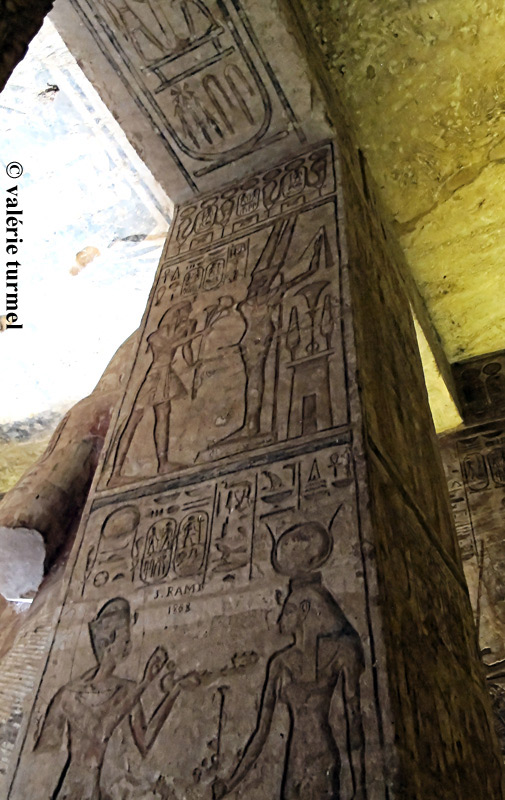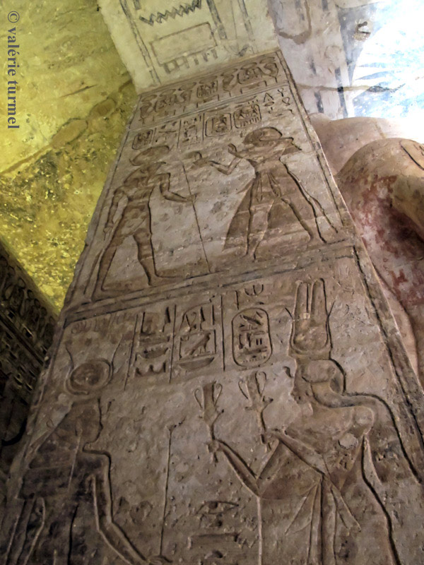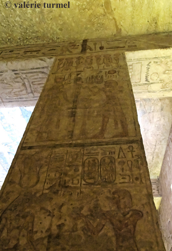 Le pilier I est le 1er pilier au Sud près de la porte d'entrée. Registre du haut : Ramsès présente une cassolette d'encens à lui-même divinisé. Le dieu porte une tête de faucon avec un disque et le croissant lunaire. Le dieu est désigné par "Ouser-Maât-Rê" (sans cartouche) dans la demeure de Ramsès (avec cartouche).