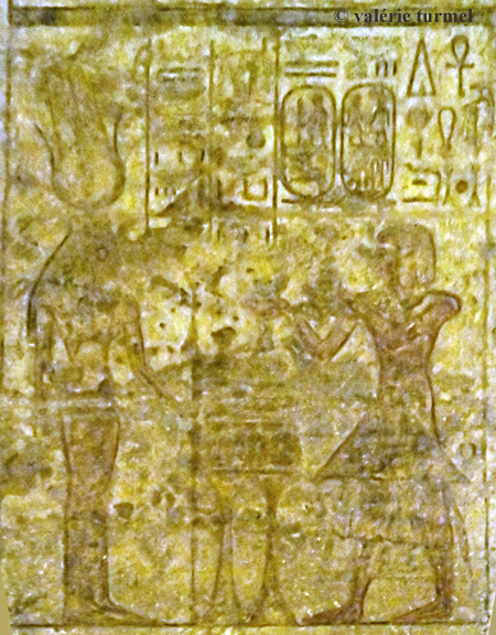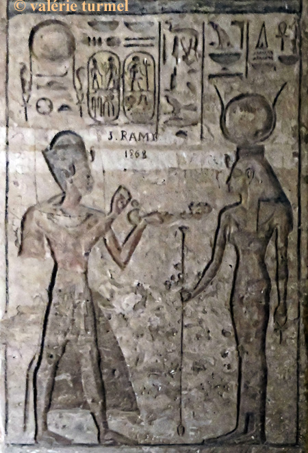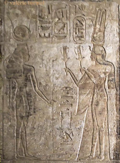 Registre du bas : Ramsès offre les vases de vin à Renenoutet, patronne des récoltes, portant un mortier surmonté de 2 hautes plumes. Le nom de Renenoutet signifie 'le serpent nourricier'. La déesse est souvent représentée comme un cobra ou avec une tête de serpent, ce qui n'est pas le cas ici;
