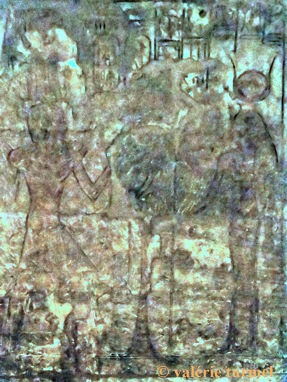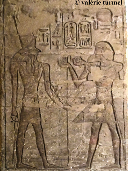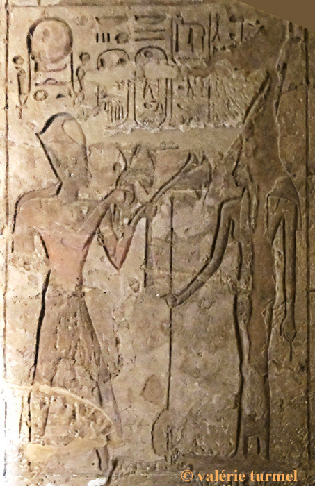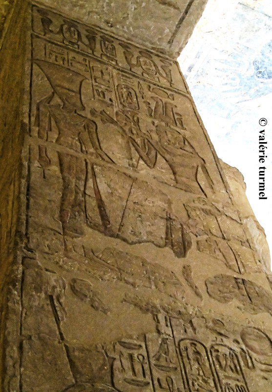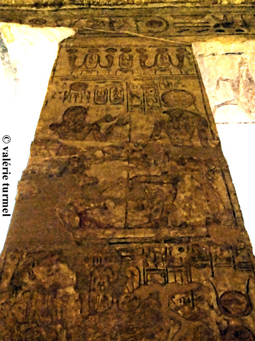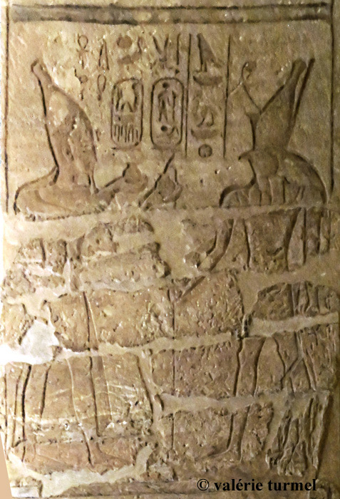 Registre du bas : Ramsès offre 2 vases de vin à l'Horus de Miam. Cette offrande de vases de vin est très présente sur l'ensemble des piliers. Dans les temples, le vin est présenté aux maîtres du temple, aux divinités d'une région productrice de vin et aux dieux héliopolitains.