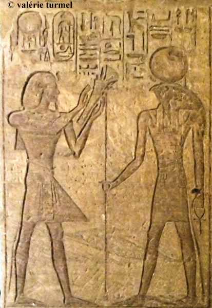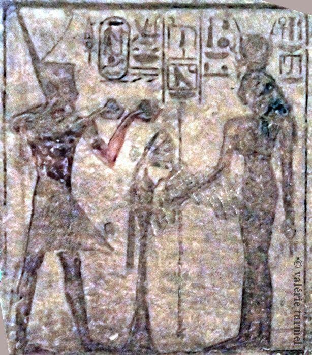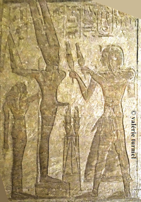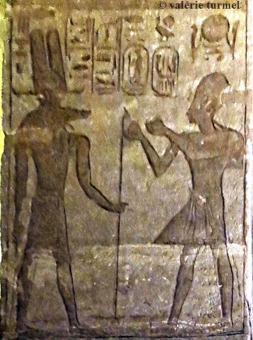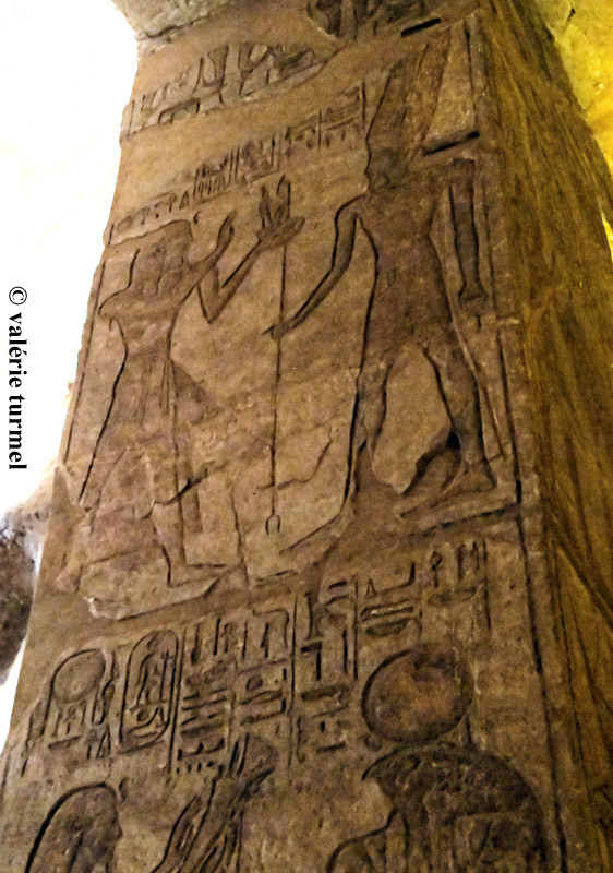 Registre du haut : Ramsès II offre les 2 vases de vin à Amon, unificateur des Deux-Terres , représenté avec une tête de crocodile. Le roi porte un pagne triangulaire.