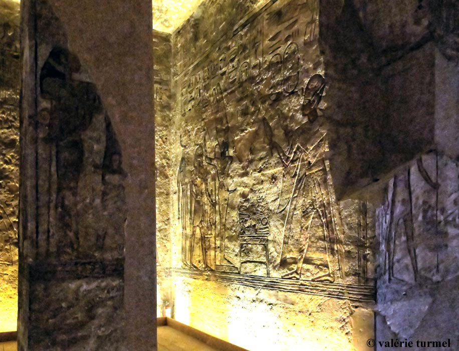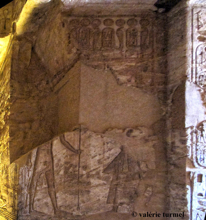 Sur le chambranle, les noms de Ramsès. Dans l'embrasure, Ramsès fait une offrande. On voit que cette partie du mur s'est dégradé.