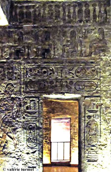 Porte latérale Nord : les noms des 5 divinités assises sont ici bien lisibles : Montou (n'est pas sur la vue), Atoum, Chou, Tefnout et Geb. La décoration est faite des cartouches du roi.