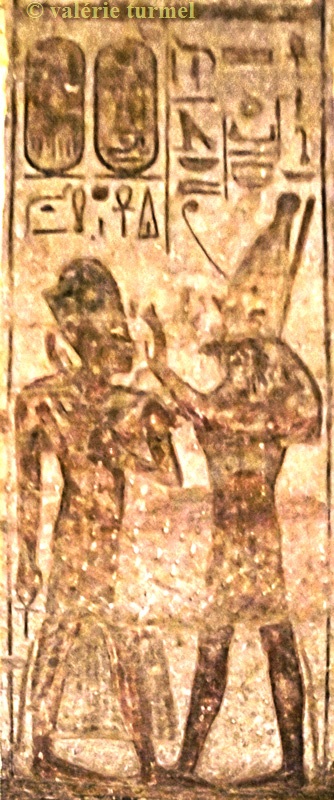 Face Est : Anouket (ou Anouquis) est enlacé par Ramsès divinisé. Le dieu a une tête de faucon surmonté e du croissant lunaire et du disque lunaire.