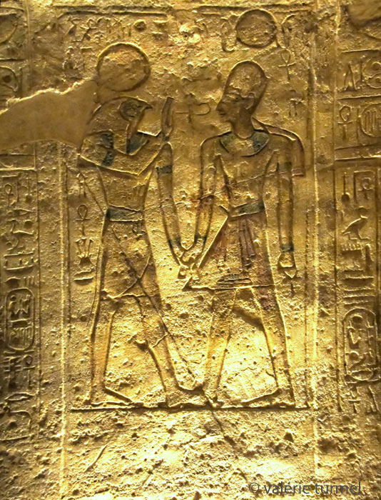 Ramsès II reçoit le signe de vie du dieu Ramsès, lui-même divinisé. De chaque côté, les encadrements des 2 portes.
