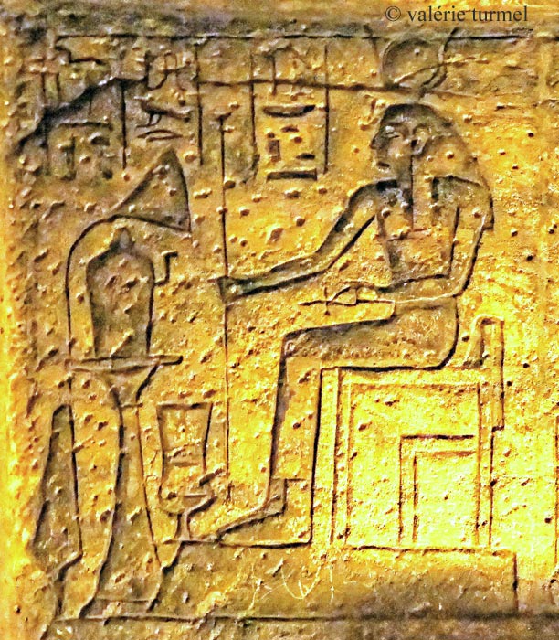 Scène de gauche en entrant : la déesse Isis est représentée seule devant un guéridon avec des offrandes.