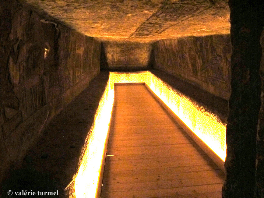 La salle P : cette salle est très mal éclairée comme la salle O . Une banquette court tout autour et le plafond comporte un bandeau d'inscriptions. Elle est notée P par Madeleine Peters-Destéract et III par Porter et Moss.