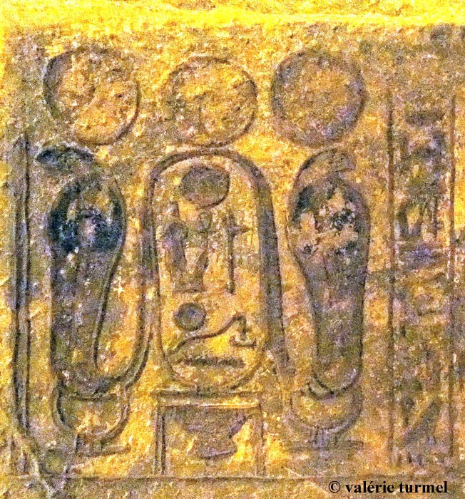 Au début des scènes de la paroi Est, se trouve cette représentation du nom de Ramsès dans un cartouche entouré de 2 uraei.