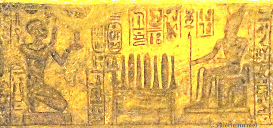 Ramsès II adore sa mère, la grande déesse Isis. Devant le roi, sur un guéridon , les offrandes.