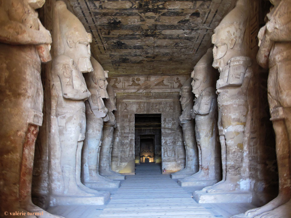 sud et le pschent au nord. Sur les 3 autres faces des piliers, sont gravées des scènes du roi avec des divinités.Entre le 3ème et le 4ème piliers du côté sud, sur un mur de 3 m. de haut, se trouve une stèle sur laquelle est gravé un texte dit 'décret de Ptah' en fait un hymne à la gloire de Ramsès II.