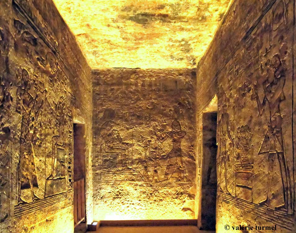 Le vestibule est une salle toute en largeur, de même largeur que la seconde hypostyle mais avec une profondeur d'environ 3,50 mètres. Trois portes forment la communication avec la seconde hypostyle, sans doute pour le passage des processions. Du côté Ouest, deux portes ouvrent sur des salles anépigraphes et une porte ouvre sur le sanctuaire. les parois sont ornées de scènes d'offrandes.