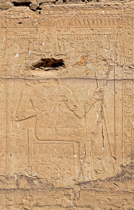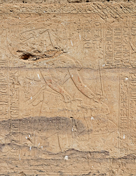 Les scènes ci-dessus sont une introduction aux scènes de bataille et se situent à gauche du mur Nord. Elles sont gravées en relief levé (haut relief). La scène de gauche montre le roi recevant des prisonniers syriens entravés (manquants sur la photo) avec, à ses pieds, un lion couché "qui massacre ses ennemis". A droite, le roi tourmente avec son cimeterre un chef lybien tjehénou.