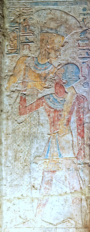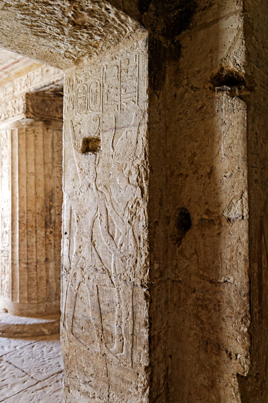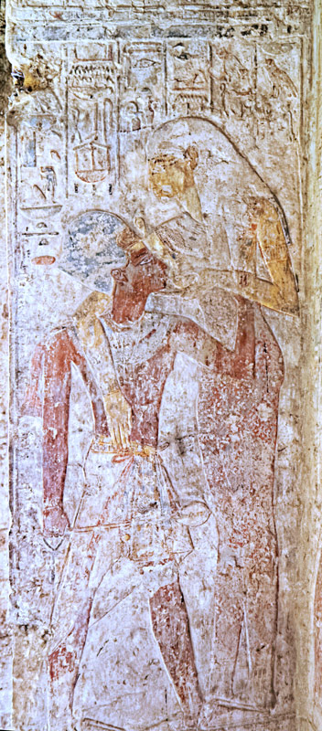 Dans l'embrasure de la porte du sanctuaire, Satis embrasse le roi. Le nom égyptien de la déeesse, Setjet, est parfaitement lisible dans les inscriptions. Ce nom signifie "Celle de Séhel", ile en amont d' Eléphantine. Elle est ici qualifiée "Maitresse du ciel" ce qui vient de son identification occasionnelle à Sothis, elle aussi liée à l'apparition de la crue.