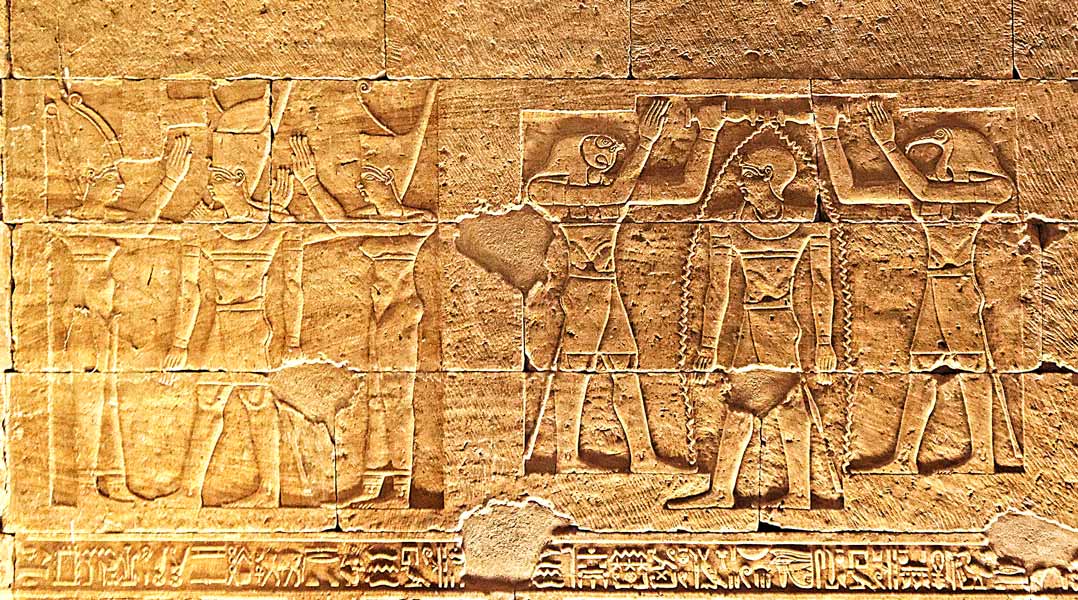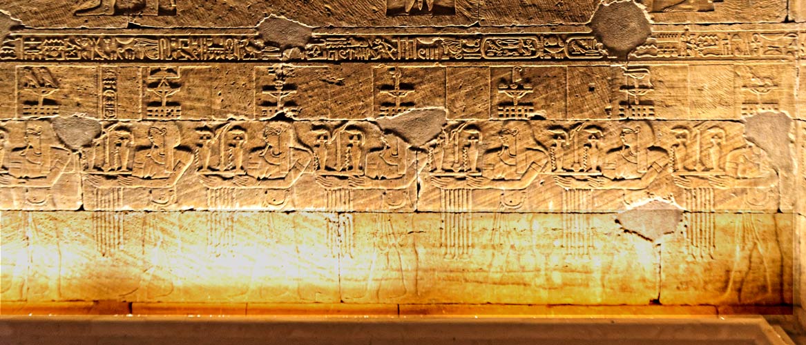 Les dieux Nil portent sur leur tête les noms des nomes de Haute Égypte : à gauche, les Deux Faucons. Ensuite on ne reconnait pas le Crocodile.