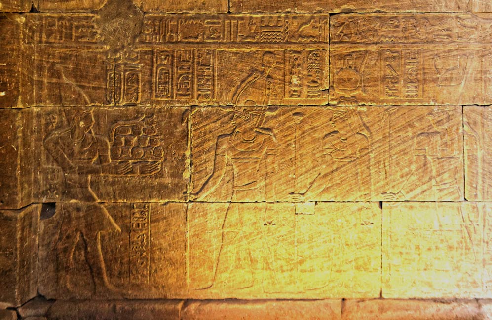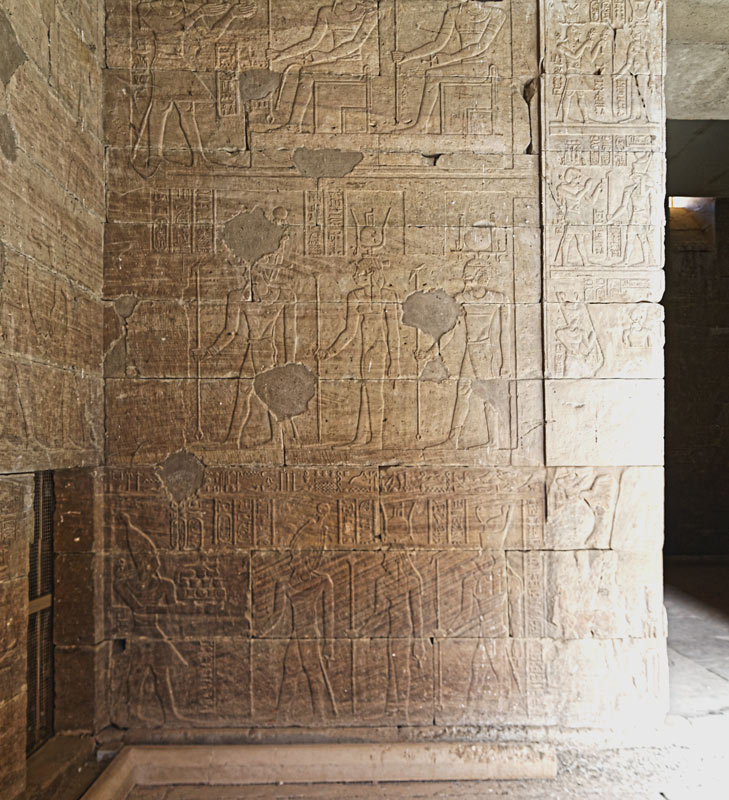 Le vestibule est moins large de ce côté, car un escalier est installé dans un espace contigu. Cette vue partielle montre qu'une seule scène occupe chaque registre. En haut, l'empereur fait l'offrande du vin à Osiris et Mandoulis. En dessous, les trois dieux font partie d'une procession se poursuivant sur la paroi Sud à gauche; En bas, l'empereur présente un plateau d'offrandes à deux formes de Mandoulis