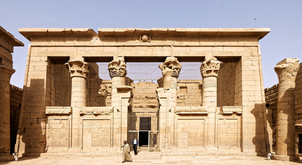 Le pronaos est constitué par 4 colonnes connectées par des murs d'entrecolonnement. Le pronaos est un élément important des temples dés la XXXème dynastie et ensuite de la période gréco-romaine. Les colonnes portent différents chapiteaux. La façade est séparée en son milieu par une porte sans linteau qui donne sur une salle hypostyle.
