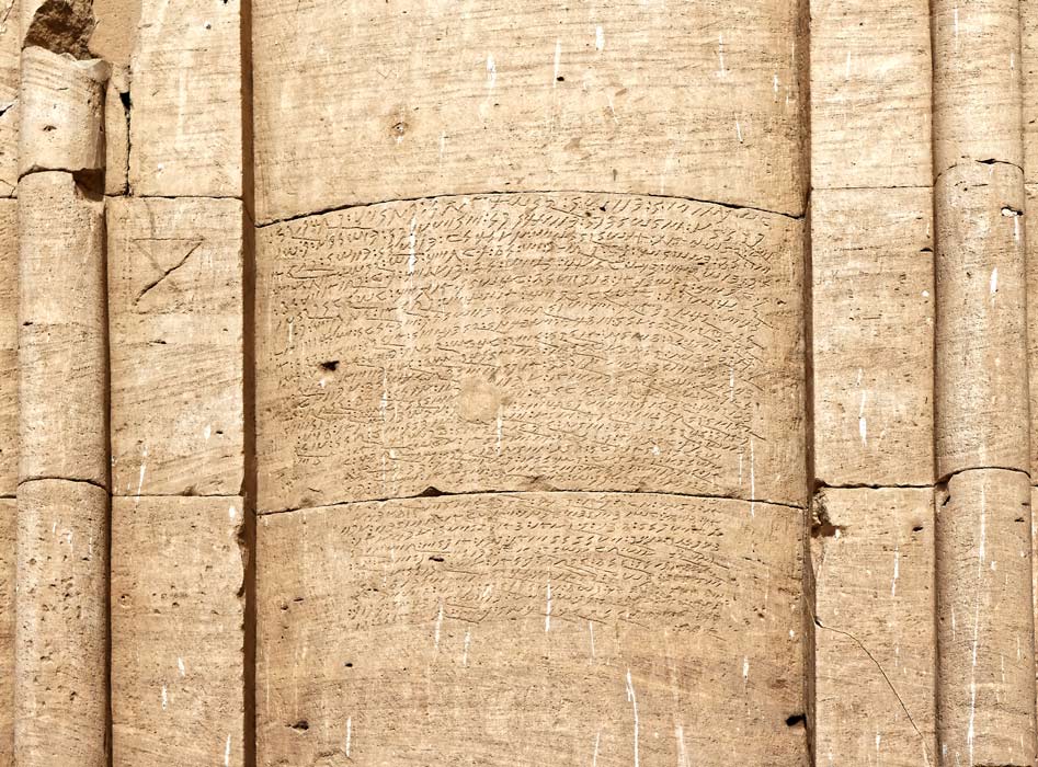 Cette inscription a été tracée en écritoire cursive méroïtique par Kharamadeye, roi des Blemmeyes. Les Blemmeyes sont une tribu qui habitait la Nubie au IIIème siècle.