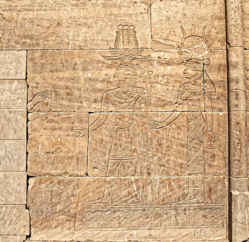 L'empereur Auguste fait une offrande devant le jeune Mandoulis dont il ne reste que la tête (voir ci-dessus) et Isis. Derrière le roi, on peut lire la formule de protection souvent écrite.