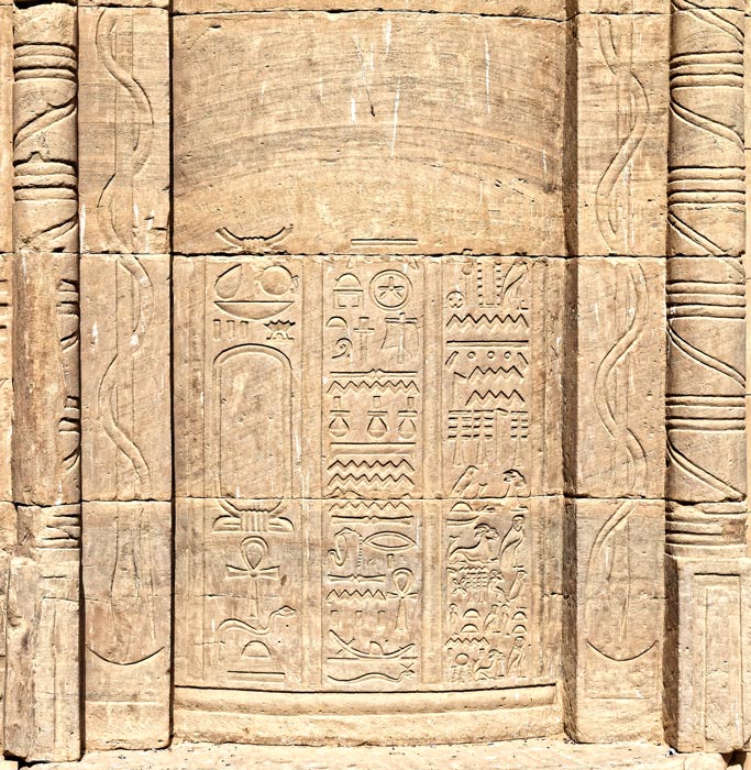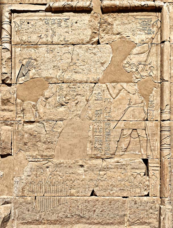 L'empereur Auguste fait une offrande devant le jeune Mandoulis dont il ne reste que la tête (voir ci-dessus) et Isis. Derrière le roi, on peut lire la formule de protection souvent écrite.