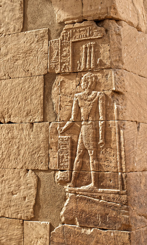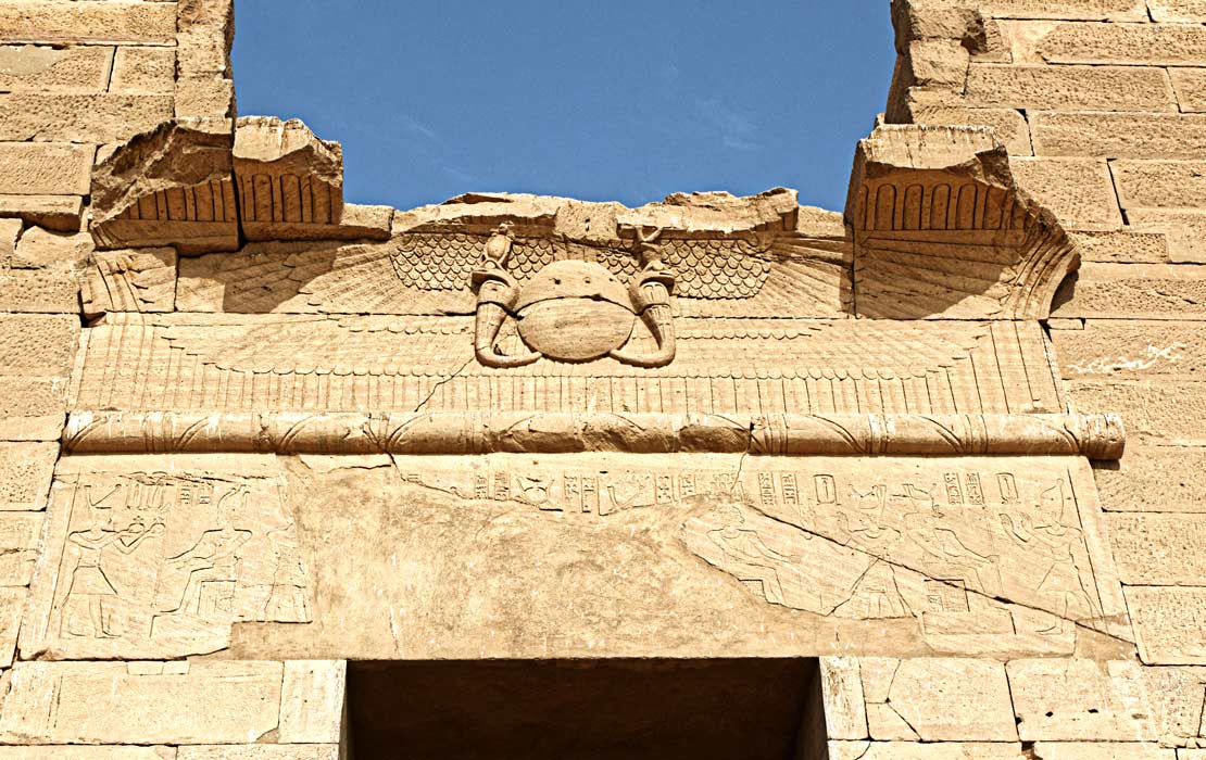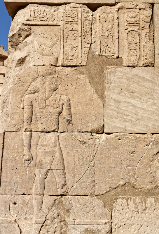 Passage de la porte, côté nord : l'empereur Auguste (non photographié) se tient devant Horis; les cartouches de l'empereur sont gravés en haut à gauche.