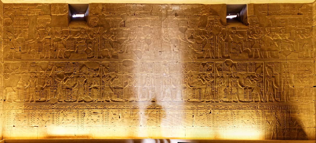 La paroi ouest comporte 12 scènes d'offrandes, soit 6 de chaque côté. Le roi est tourné vers le centre de la paroi. Le tetxe démarre au milieu de la paroi vers les extérieurs. En dessous, les dieux Nil sont menés par le roi vers des divinités..