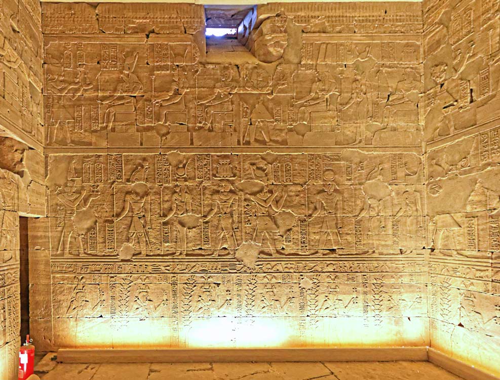 Cette vue montre la paroi Sud avec à gauche la porte donnant sur la petite piece; Sont gravés 4 scènes d'offrandes et la suite de la procession des dieux Nil qui se termine en bas de la paroi Ouest. Le texte continue en dessous des scènes du bas.