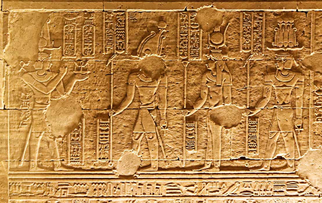 Scène en bas, à droite : l'empereur offre les symboles de le la vie et de la puissance à Osiris, Isis. et Mandoulis. Derrière le roi'(empereur) la formule de protection habituelle. Une partie du nom d'Osiris est dans un cartouche. Osiris dit au roi que tous les pays sont sous ses sandales. Isis lui donne toute la vie et puissance.